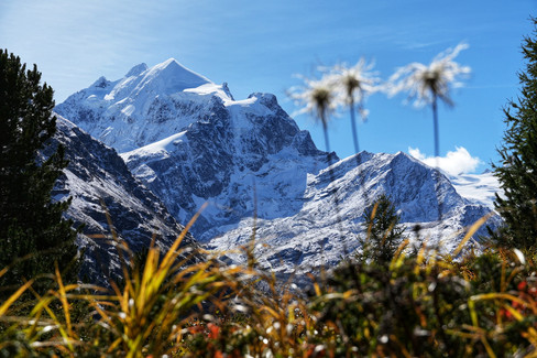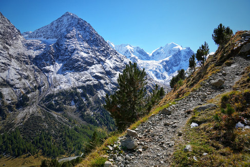 Von meiner Recherche auf swisstopo wusste ich, dass einer der Wege gesperrt war, so ging ich auf dem breiten Wanderweg, den auch die Pferdekutschen nutzen, Tal aufwärts. Schon bald fing der Nebel an, sich etwas aufzulösen und man konnte die ersten Bergspitzen erkennen. Ich folgte dem Weg über eine Brücke und konnte danach direkt am Fluss den Anblick auf das Bernina-Massiv geniessen (Bild rechts). W-O-W.